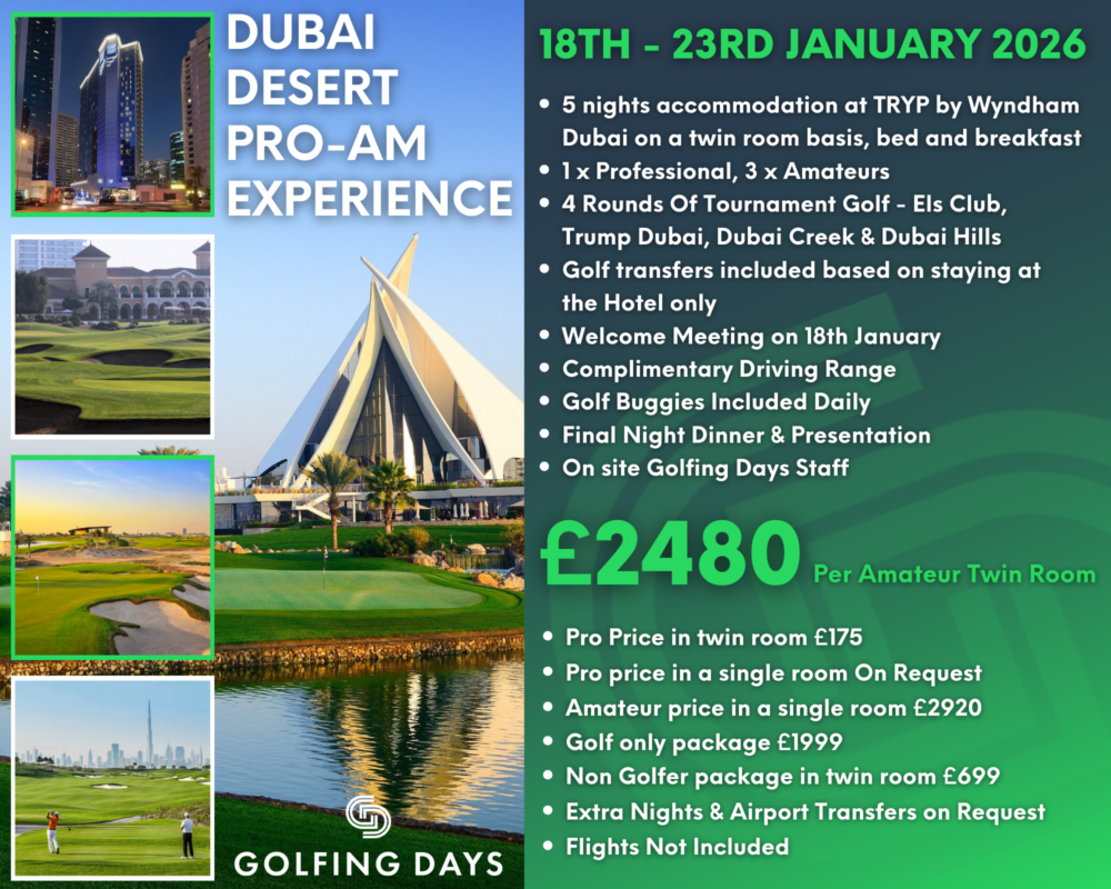 Van 18 t/m 23 januari 2026 wordt in Dubai een Pro-Am wedstrijd georganiseerd. Hierbij loopt u in een flight van 4 golfers waaronder 1 golf professional en golft u tegen andere teams. Voor uw deelname